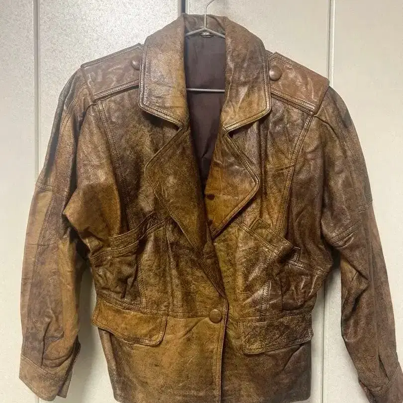브라운 계열의 천연 가죽에 적절한 유즈드 가공이 더해져 멋스러운 질감이 매력적입니다. 어깨에는 패드가 있어 탄탄한 실루엣을 연출하며, 허리는 쉐이프된 디자인입니다.