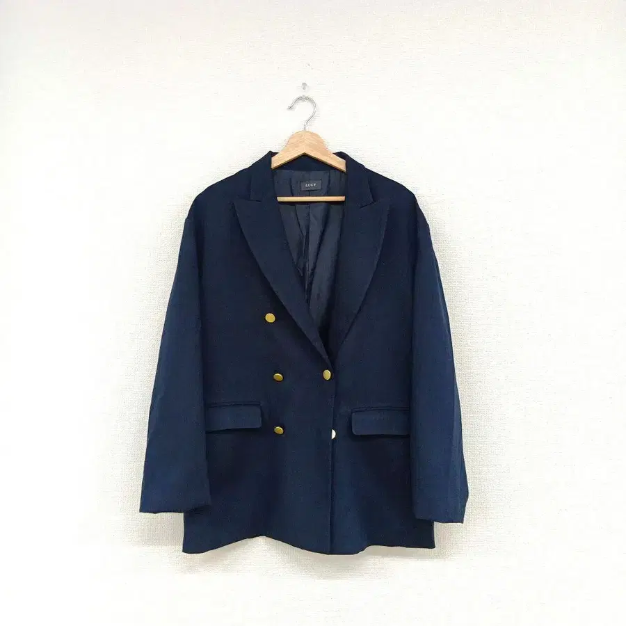 네이비 색상의 더블 브레스트 자켓, 골드 버튼 포함.