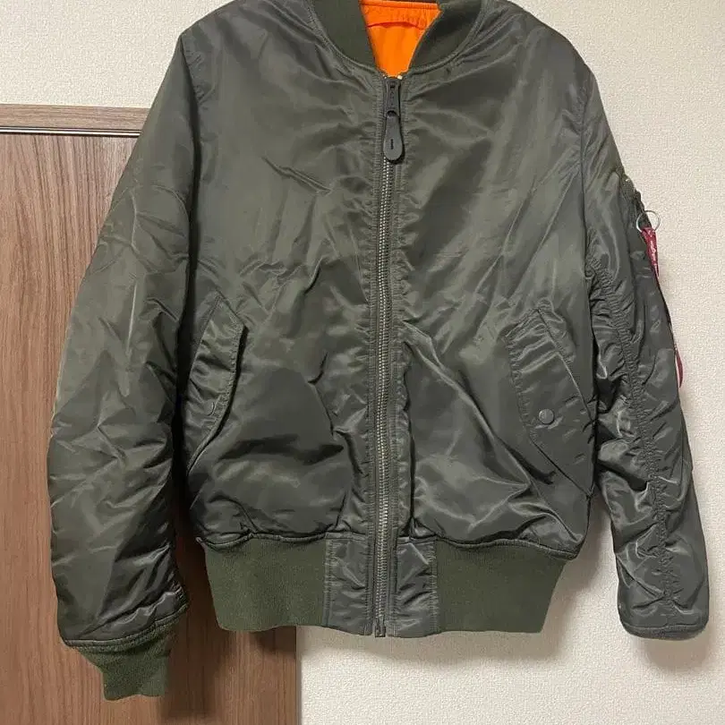 올리브 컬러의 MA-1 스타일 자켓, 오렌지 안감과 REMOVE BEFORE FLIGHT 택 포함.