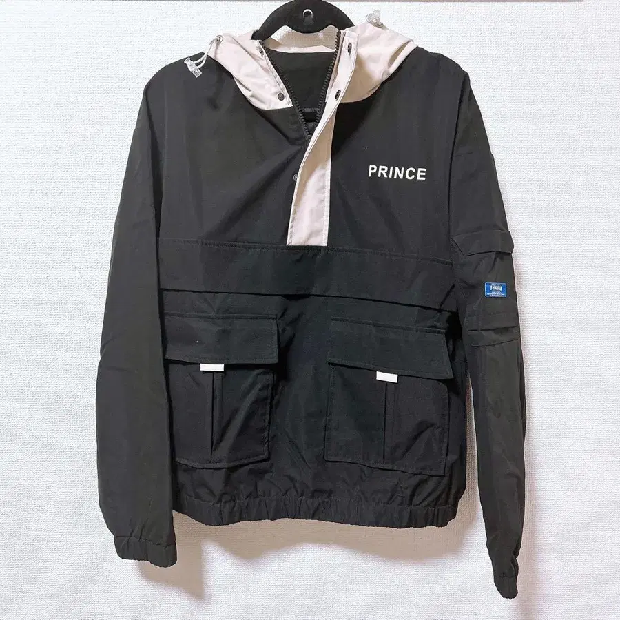아노락 스타일의 나일론 자켓, 프론트에 2개의 포켓과 큰 백 로고가 특징. - 브랜드: PRINCE - 색상: 블랙/화이트 - 스타일: 아노락 자켓 - 포켓: 프론트 포켓 2개 - 디자인: 백에 큰 로고 프린트 - 기장 약 65cm - 가슴 너비 약 55cm 나일론 후드티 prince 프린스 스포티 바람막이