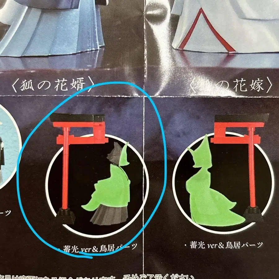 여우의 시집가는 날 가챠가챠 여우 신랑 축광ver & 도리이 부품 파란색 원으로 둘러싸인 것만 해당됩니다. 실제로 보내는 상품 사진은 이미지 2입니다. 캡슐에 담긴 채 보관 중이지만, 캡슐 없이 발송됩니다. 에어캡으로 보호하여 OPP 봉투에 넣어 발송합니다.