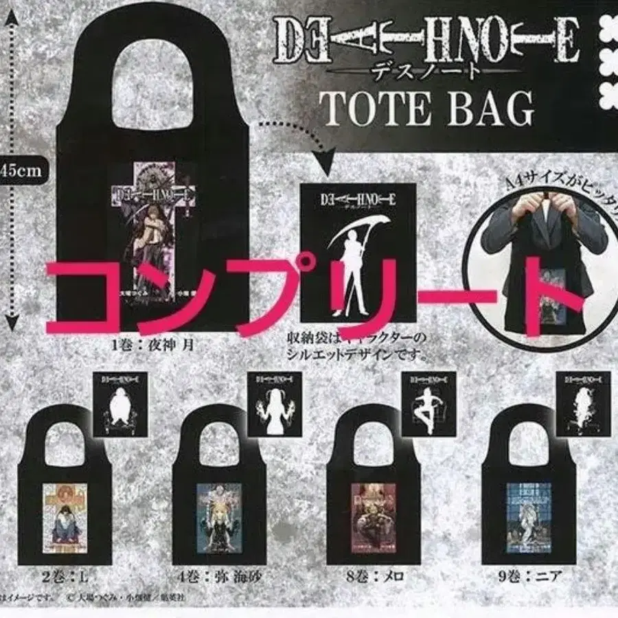 데스노트 캐릭터가 디자인된 약 45cm 토트백, A4 사이즈가 들어가는 실용적인 아이템입니다. - 사이즈: 약 45cm - 디자인: 데스노트 캐릭터 - 타입: 토트백 - 스타일: A4 사이즈 대응 방문해 주셔서 감사합니다.