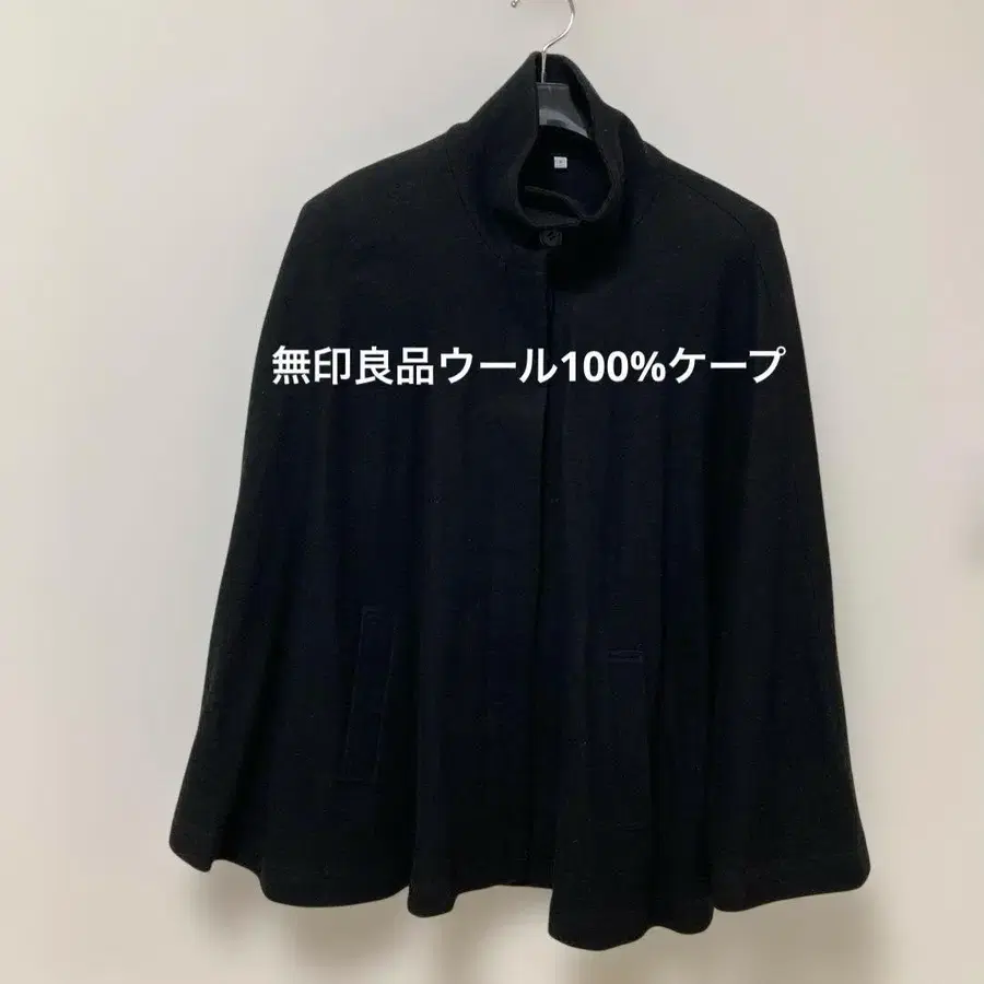 울 블랙 케이프 스타일 자켓, 사이드 포켓 포함.