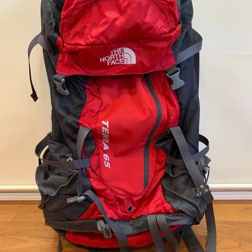 65L 용량의 빨간색과 블랙 백팩으로, 등산 및 아웃도어 활동에 최적입니다.