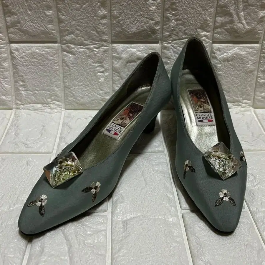 그린 계열의 그레이 펌프스, 꽃 자수와 와이드 힐 포함.