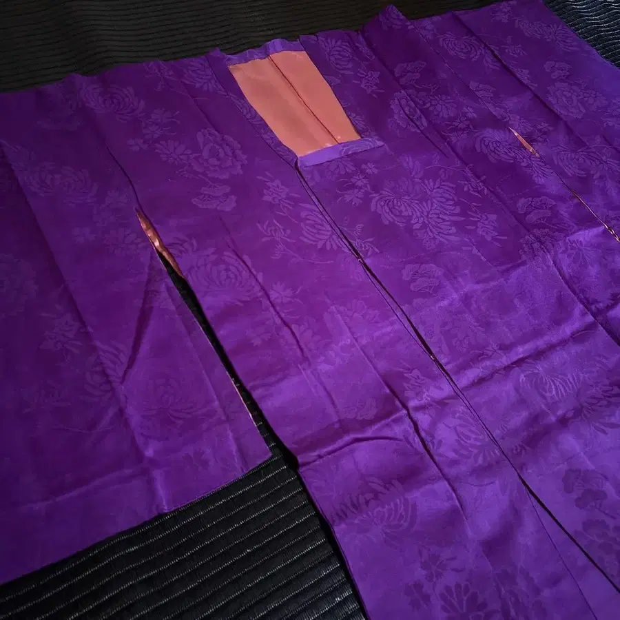 보라색 꽃무늬 디자인이 들어간 기모노 코트.