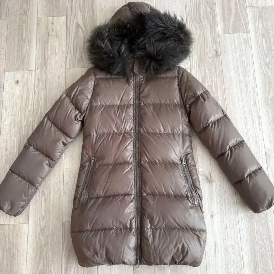 후드에 퍼가 달린 브라운 다운 자켓, 사이즈 40.