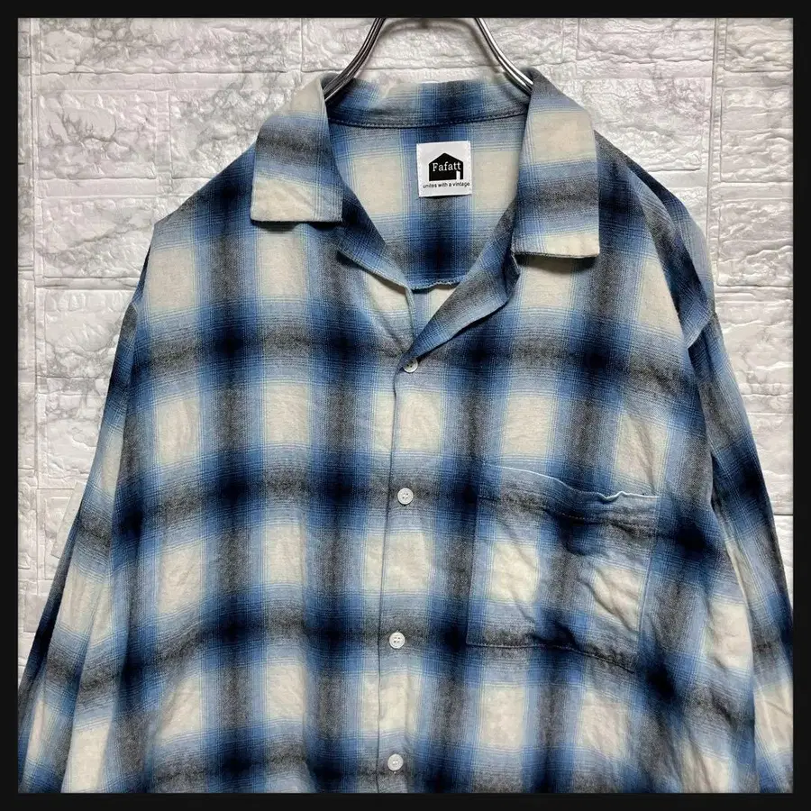 빈티지 오픈 카라 옴브레 체크 셔츠 코튼 100 파랑 화이트