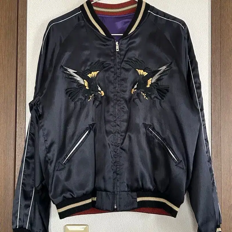 검은색 새틴 면에 독수리 자수가 검은색 실로 된 모노톤 스카잔. 실물에서도 그 수는 드물고, 매우 가치 높은 배색으로 평가받고 있습니다. 골드 부리, 발톱, 실버 머리, 깃털 끝 자수가 검은색과의 절묘한 대비를 자아내며, 검은색과 반대되는 보라색 면에는 등에는 호랑이, 가슴에는 호랑이와 용 자수를 넣어 검은색과는 상반되는 화려한 마감입니다. 이 한 벌로 스카잔에 빠질 수 없는 대표적인 모티브인 독수리, 호랑이, 용을 충분히 즐길 수 있는 자켓으로 완성되었습니다.
