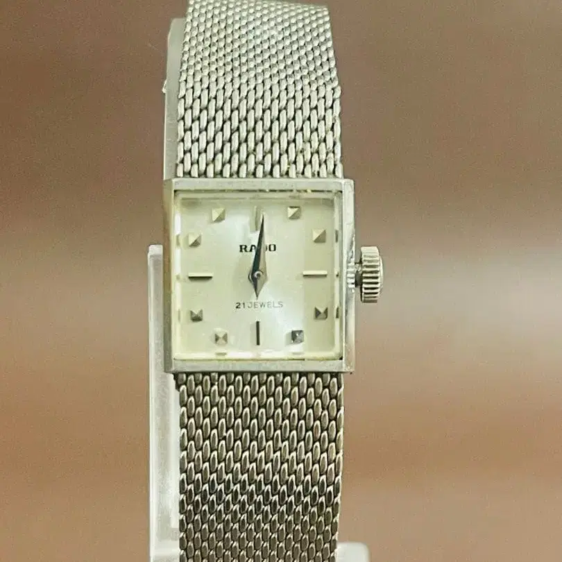 자동 번역되었어요. 원문보기실버 메쉬 밴드와 스퀘어 케이스를 가진 RADO 수동 와인딩 시계.