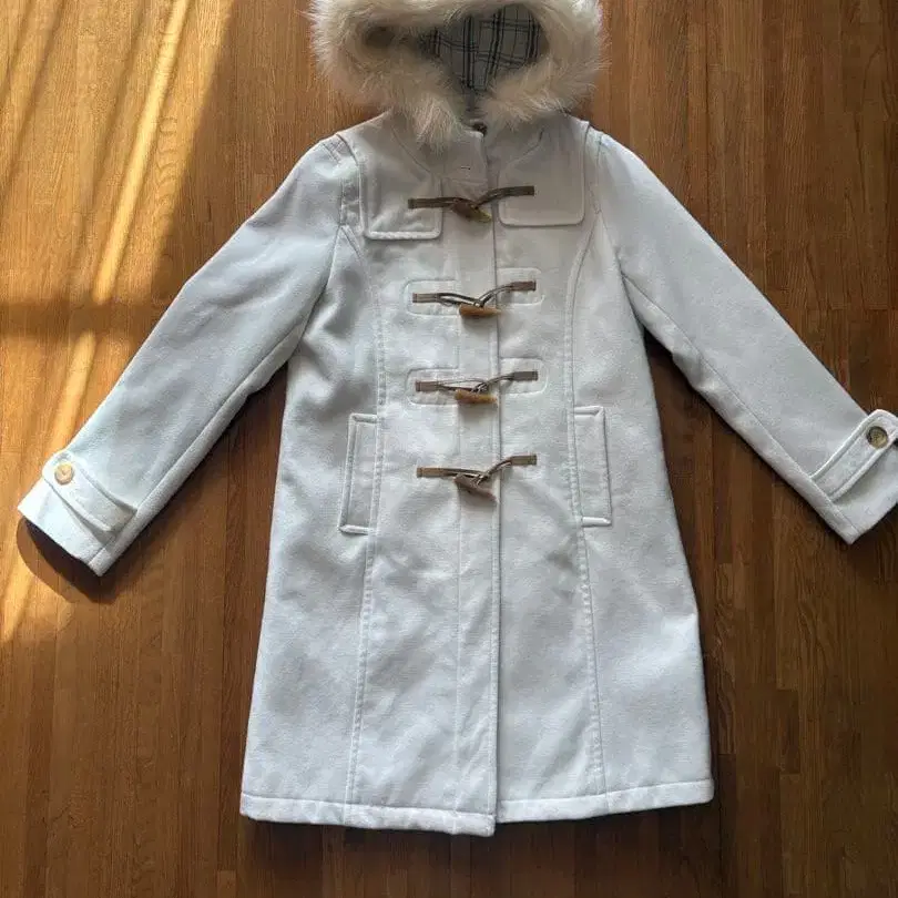 자동 번역되었어요. 원문보기퍼가 달린 후드와 체크 무늬 안감이 특징인 화이트 더플 코트!