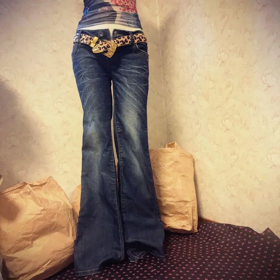 헤이세이 갸루 Y2K 부츠컷 데님 플레어 데님 다크 블루 그런지