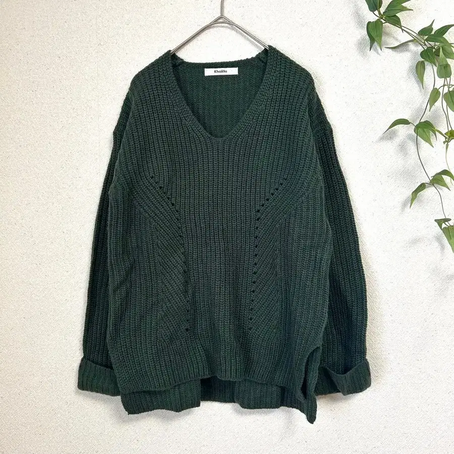 Khalita M V넥 니트 다크 그린 오버 사이즈