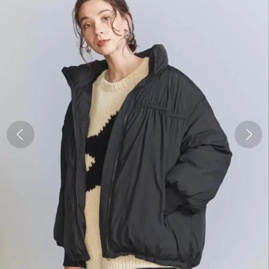 다운의 양도 적당하며, 두께감이 있는 편이 아니라 스마트하게 착용 가능합니다. 가슴 부분의 개더가 독특하며 시크하게 코디할 수도 있습니다.