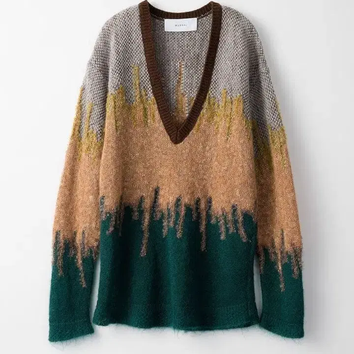 로우 게이지 5G로 편직했으며, 모헤어 기모사, 모헤어 몰사, 울 방모사 등 한 벌에 8종류의 실을 사용했습니다.