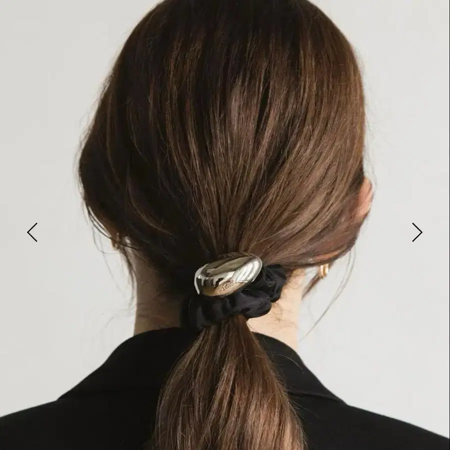 머리를 묶는 것만으로도 성숙하고 고급스러운 느낌을 연출하는 스크런치는 둥근 금속이 나일론의 원단감 및 볼륨감과 대비를 이루어, 다양한 패션 장면에 활용할 수 있습니다.