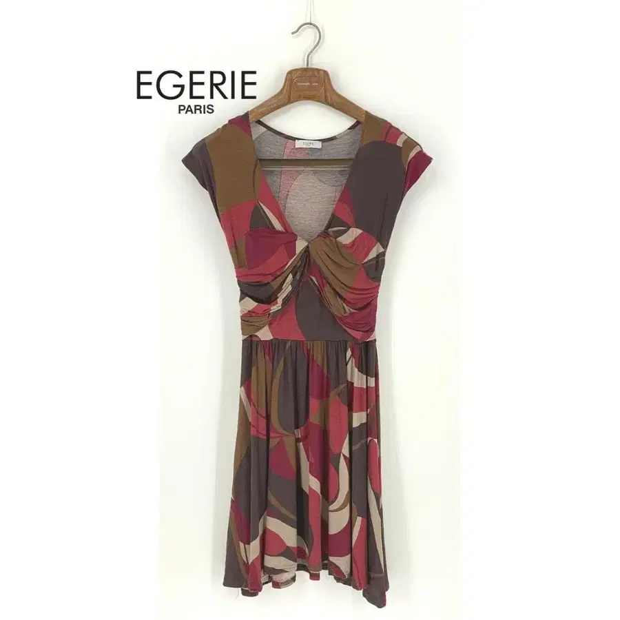 B0065/컨디션 최상 EGERIE 에제리 스트레치 올 패턴 슬리브리스 개더 플리츠 무릎 기장 미니 원피스 M 정도 빨간색 브라운 프랑스제 여성용