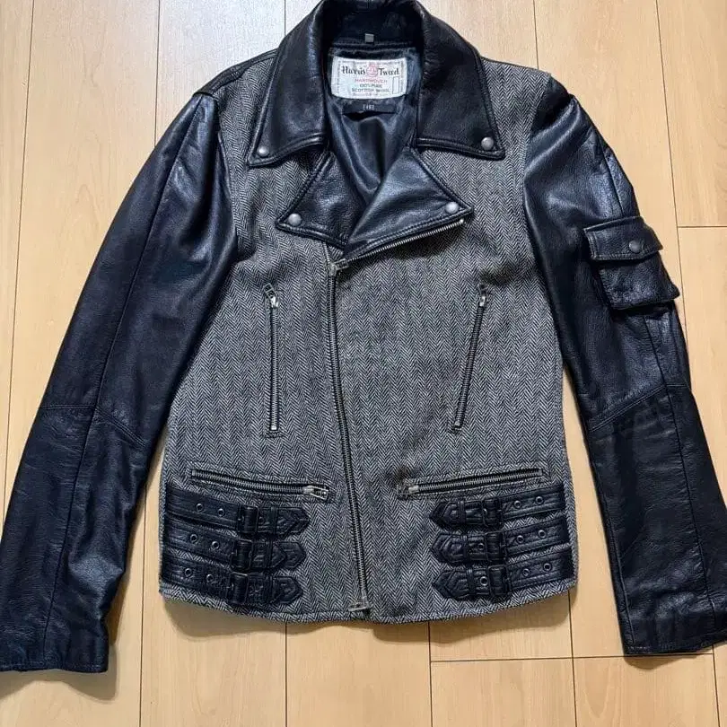 Harris & Tweed 가죽과 울의 콤비네이션, 라이더 스타일의 자켓. - 색상: 그레이와 블랙의 콤비네이션 - 소재: 가죽과 울 혼합 - 디자인: 라이더 자켓 스타일 - 특징: 사이드 지퍼 포켓 부착 - 안감: 매끄러운 블랙 안감 사이즈 M 기장 61 가슴 너비 48 소매 길이 65 어깨 너비 43 방문해 주셔서 감사합니다.
