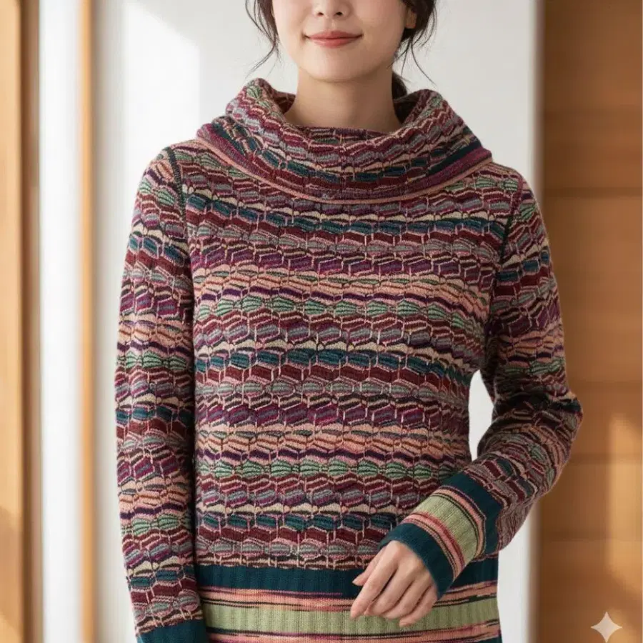 자동 번역되었어요. 원문보기디자인 - 터틀넥 사양으로 목둘레를 확실하게 보온. - 레트로한 보더 무늬와 올 패턴의 조합이 독자적인 스타일을 연출하며 패션의 악센트가 됩니다.