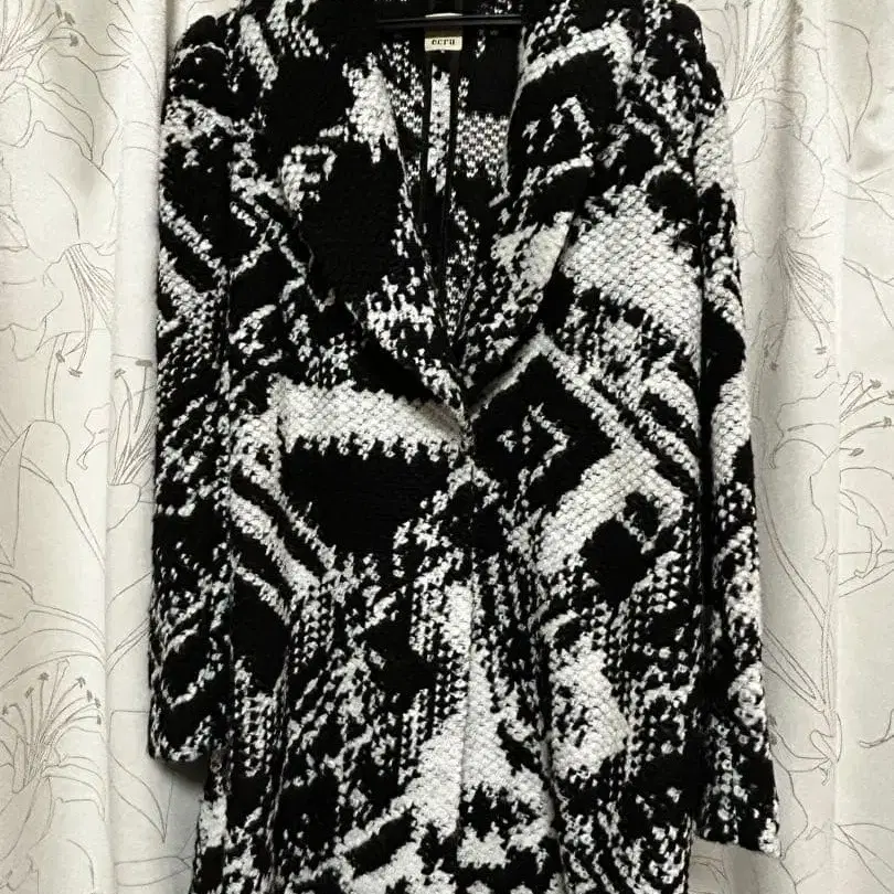 블랙과 화이트의 기하학 패턴이 특징인 넉넉한 롱 코트. - 색상: 블랙, 화이트 기하학 패턴 - 스타일: 롱 코트 - 소재: 니트풍 원단 - 디자인: 오픈 프론트 - 특징: 넉넉한 실루엣 방문해 주셔서 감사합니다.
