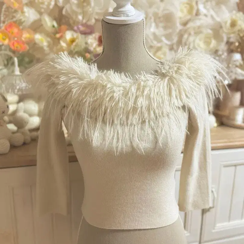 스나이델 퍼 니트 상의 아이보리 오프숄더