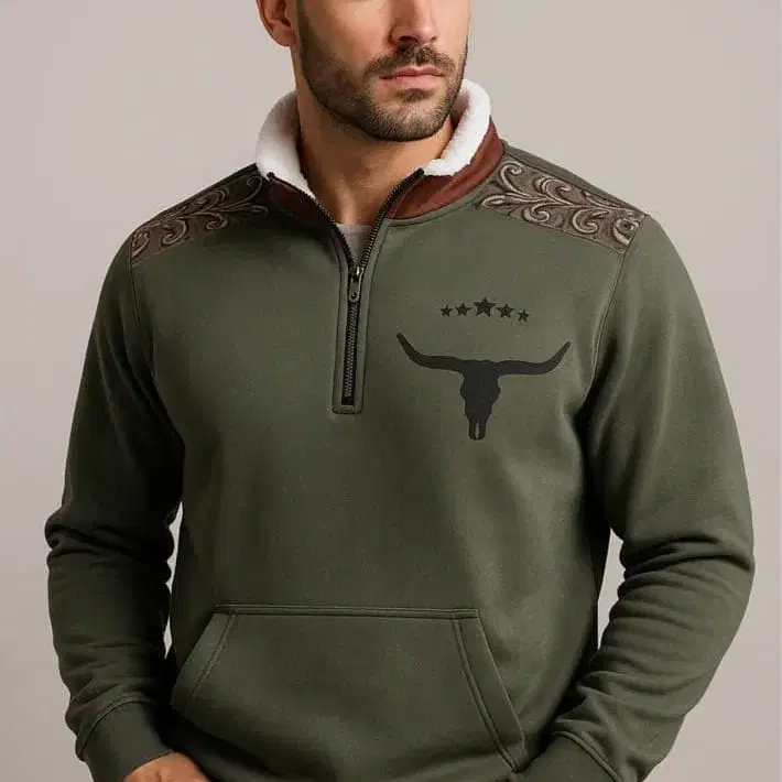 올리브 그린 플리스 트레이너, 퍼 하프 지퍼, 소 머리 로고 디자인.