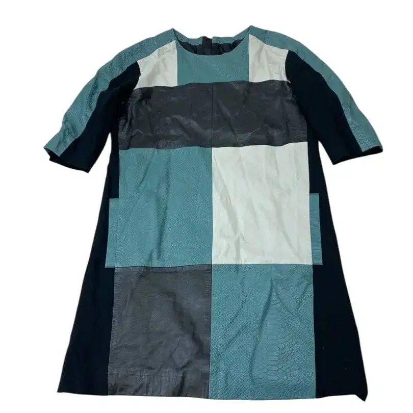 #블루 계열과 블랙 계열의 가죽 패치워크 디자인의 칠부 소매 튜닉. - 색상: 블루 계열, 블랙 계열, 화이트 계열 패치워크 - 디자인: 칠부 소매, A라인 실루엣 - 지퍼: 뒷면 지퍼 있음 - 소재: 이종 소재 (가죽, 텍스타일) - 사이즈: 42 (2 L) - 기장 82 - 가슴 너비 47 - 어깨 너비 - - 소매 길이 47 방문해 주셔서 감사합니다.