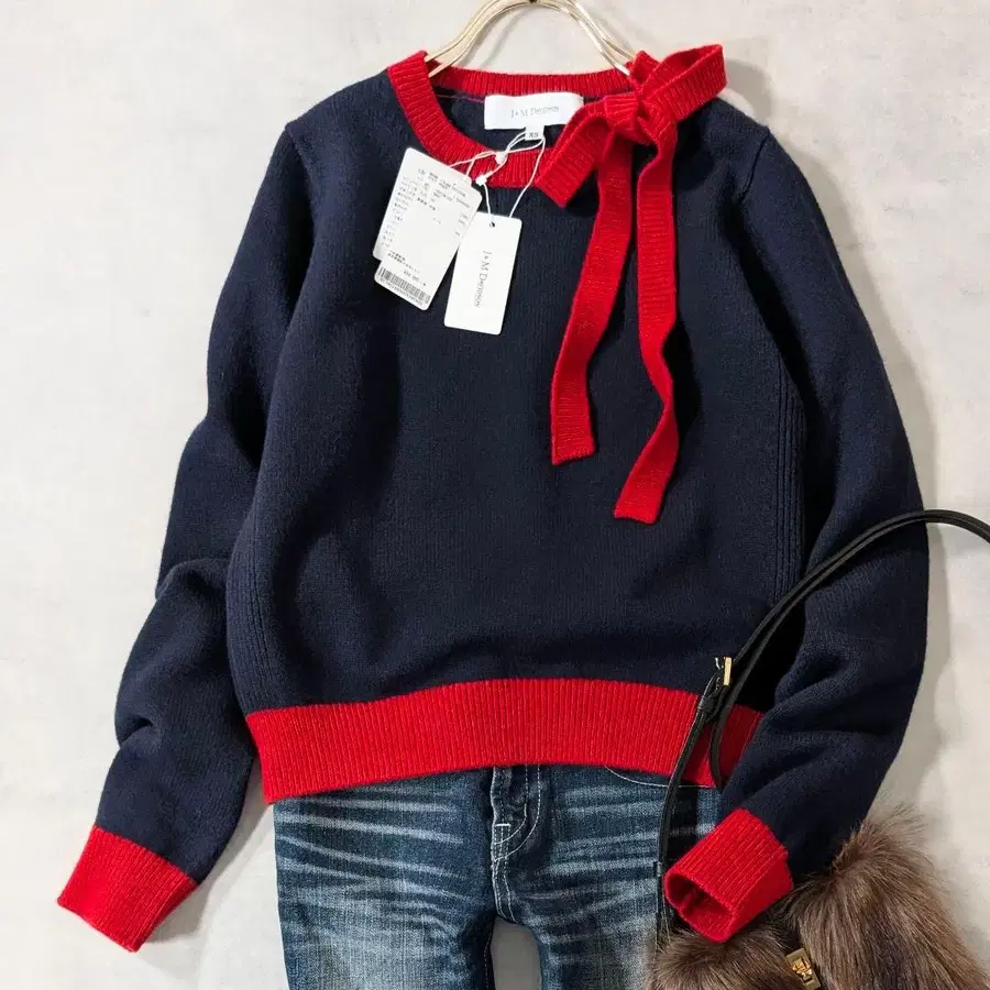 미사용 J&M DAVIDSON 바이컬러 리본 울 니트 네이비 레드