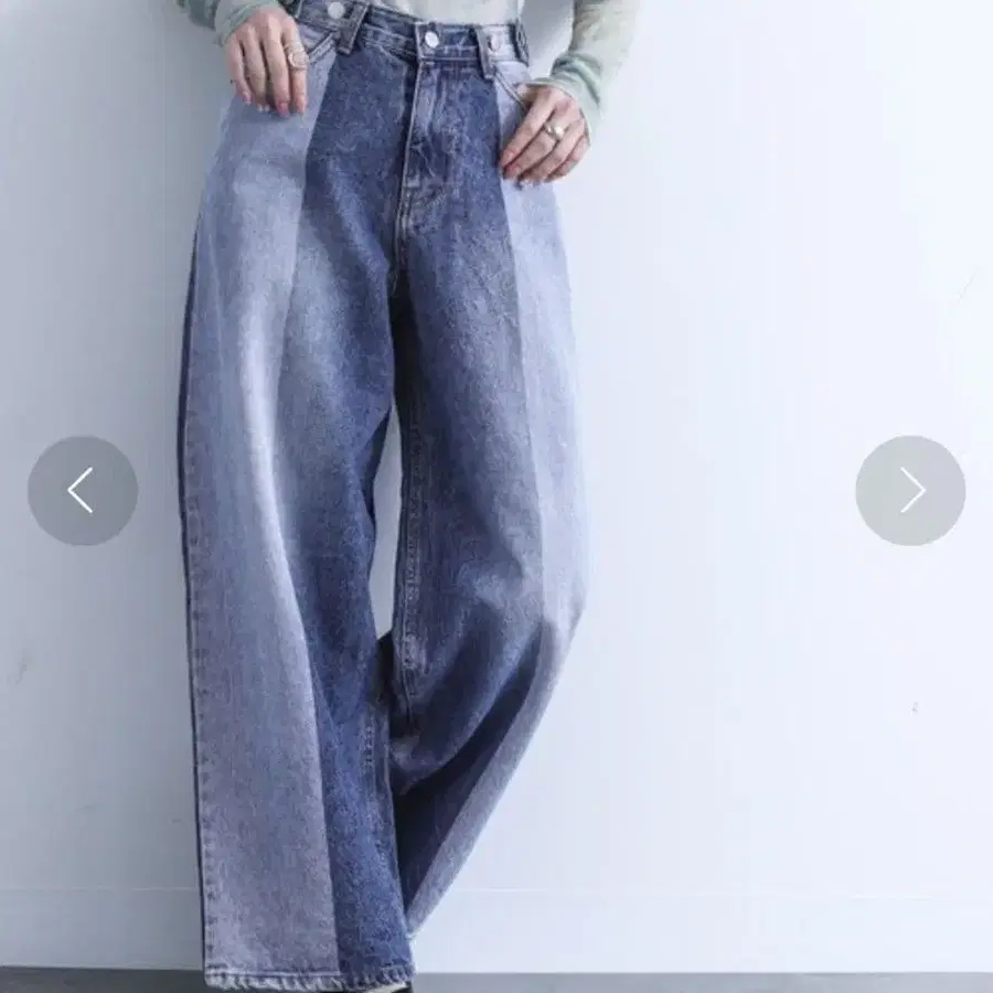바이컬러 그라데이션 블루가 특징인 와이드 레그 데님.