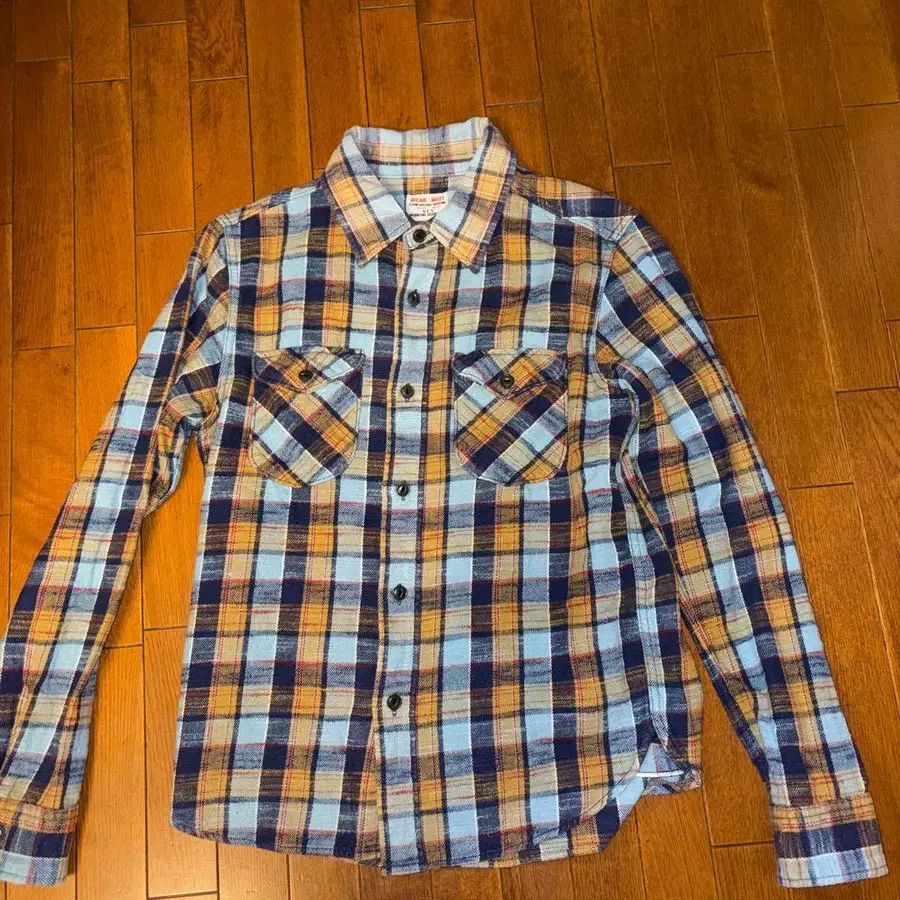 UES의 긴팔 플란넬 셔츠 파랑 오렌지 체크 무늬