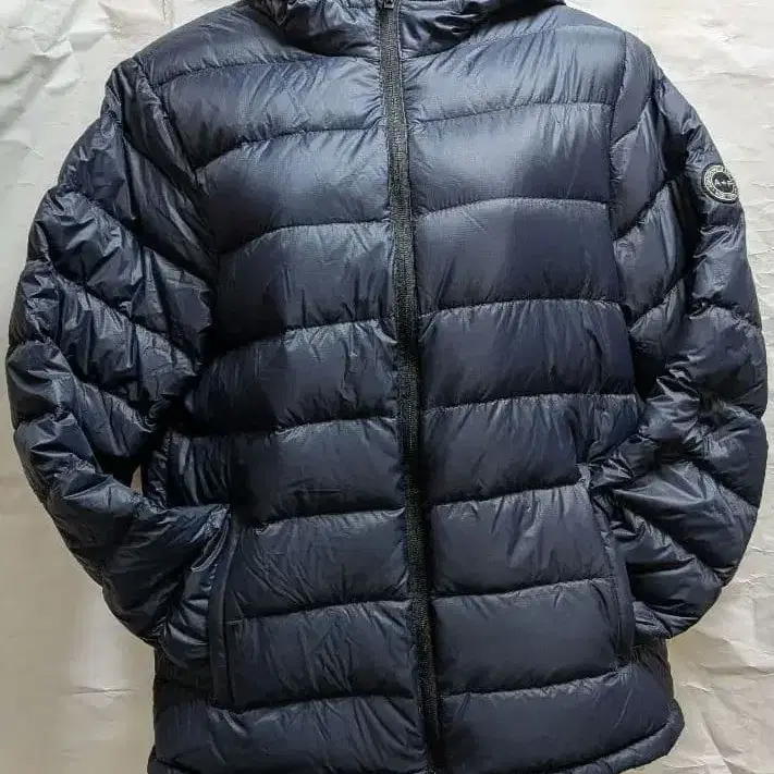 네이비 색상의 후드 부착 다운 자켓, 퀼팅 디자인.