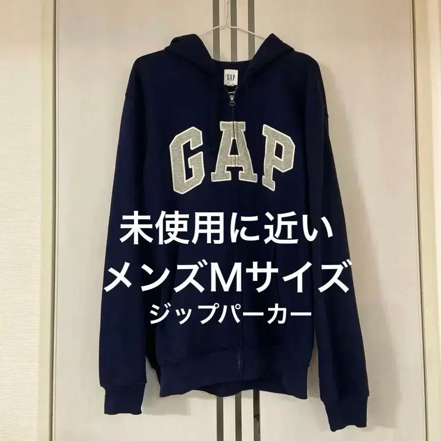 GAP의 네이비 풀 지퍼 후디, 자수 로고 포함.