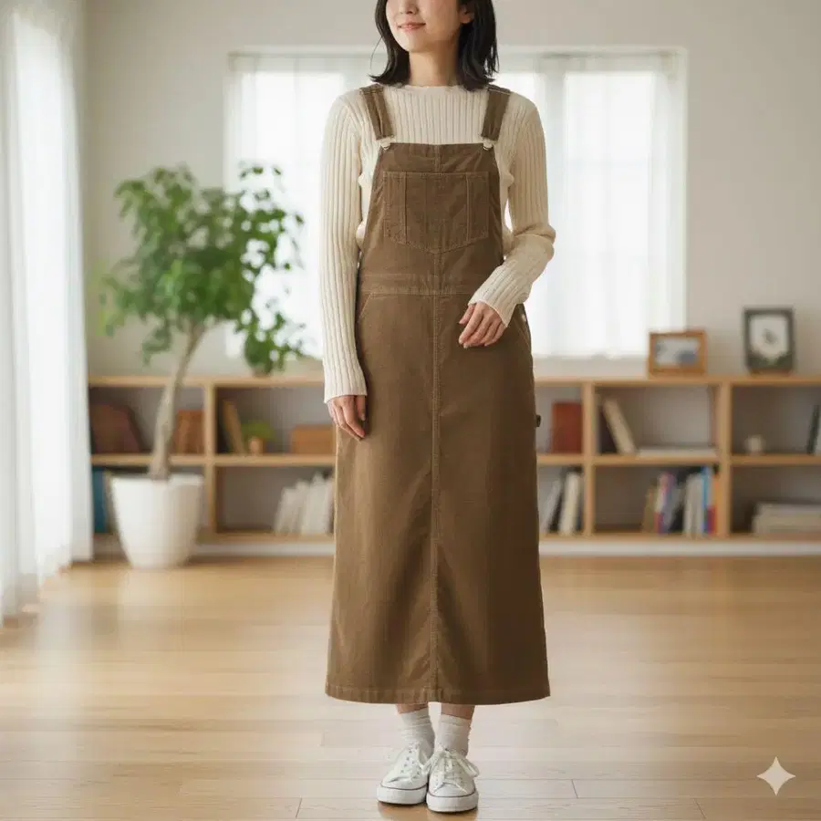 자동 번역되었어요. 원문보기- 따뜻함이 느껴지는 브라운 코듀로이 원단이 매력적인 RCW의 오버롤 스커트.