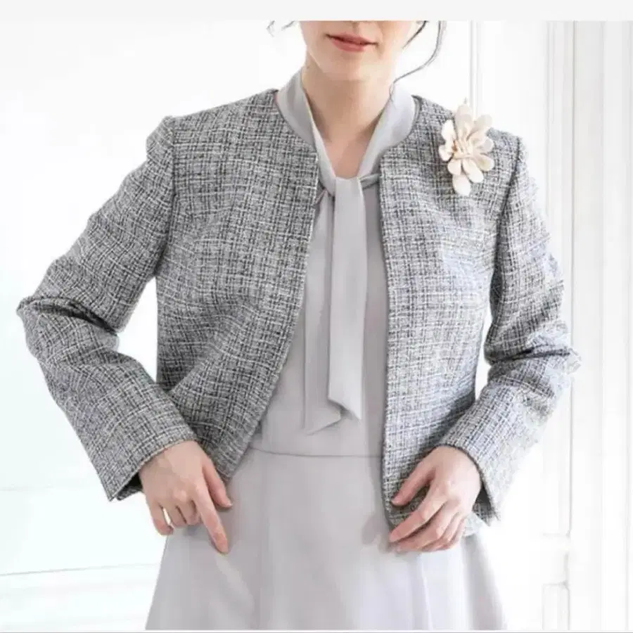 보타이 스타일의 옷깃이 달린 더스티 컬러의 화려한 원피스와 심플한 트위드 자켓의 2세트.