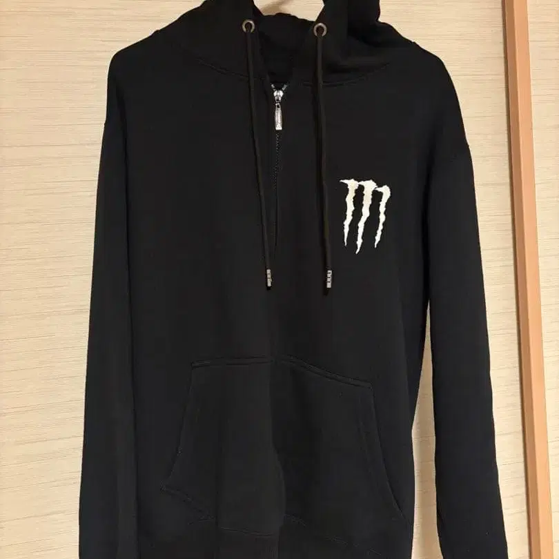 몬스터 에너지 로고가 특징인 블랙 풀 집업 후드티.