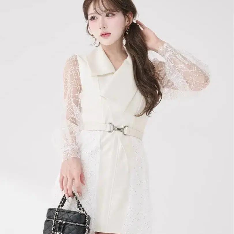 레이스 디테일이 있는 화이트 미니 원피스, 허리 벨트가 있어 스타일리시합니다.