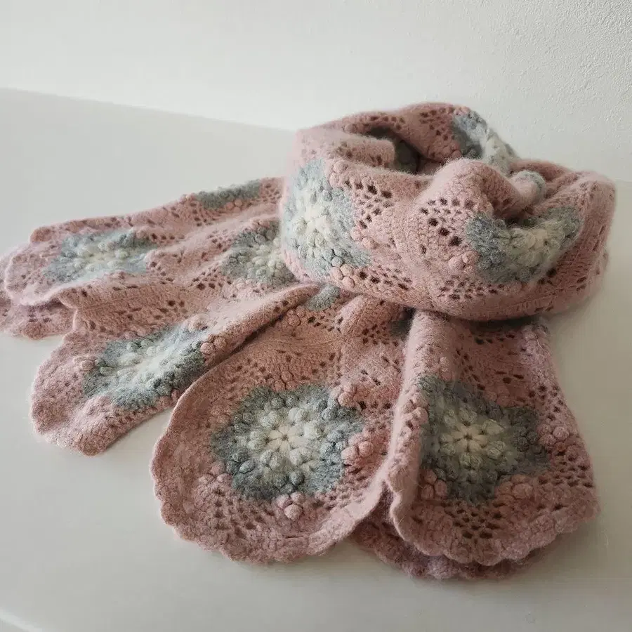 핸드메이드 스톨 숄 머플러 무릎 담요 더스티 핑크 모티브 뜨개질