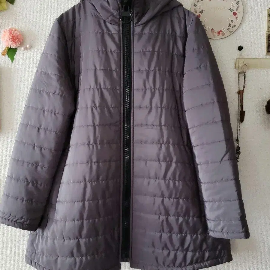 자동 번역되었어요. 원문보기퀼팅 디자인의 그레이 후드 부착 자켓.