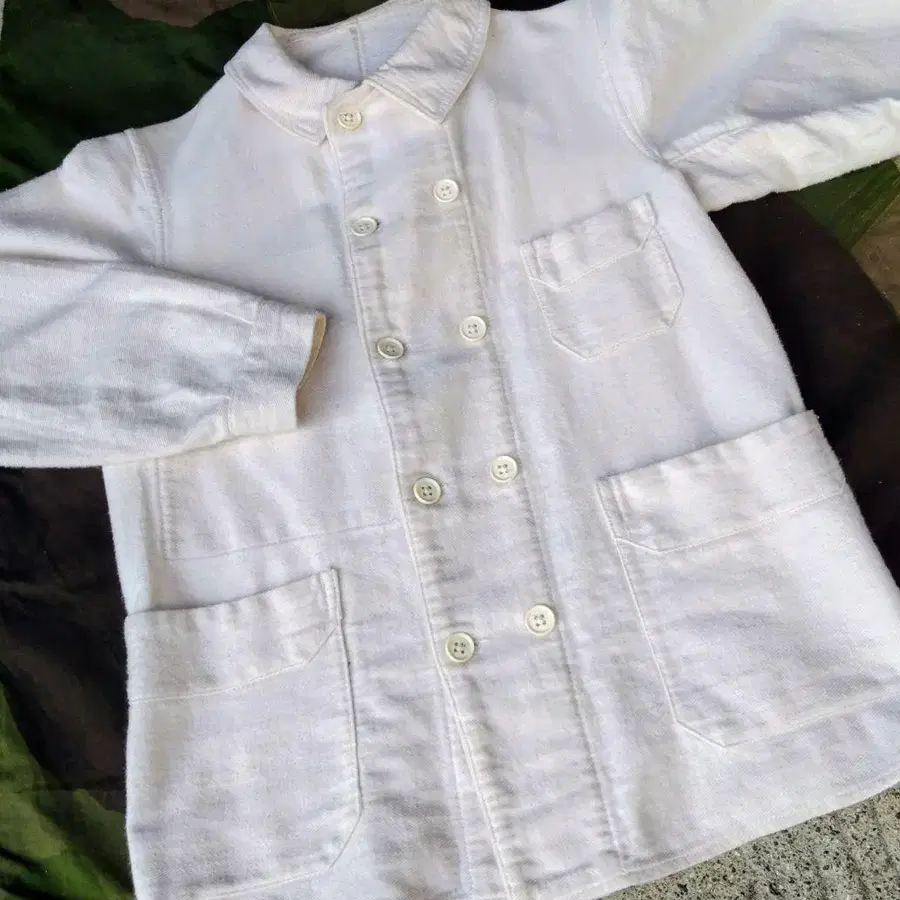 프렌치 빈티지의 오래된 연대의 에크루 더블 브레스트 워크 자켓입니다. 허리가 쉐이프된 뒷면의 실루엣이 특징적입니다.