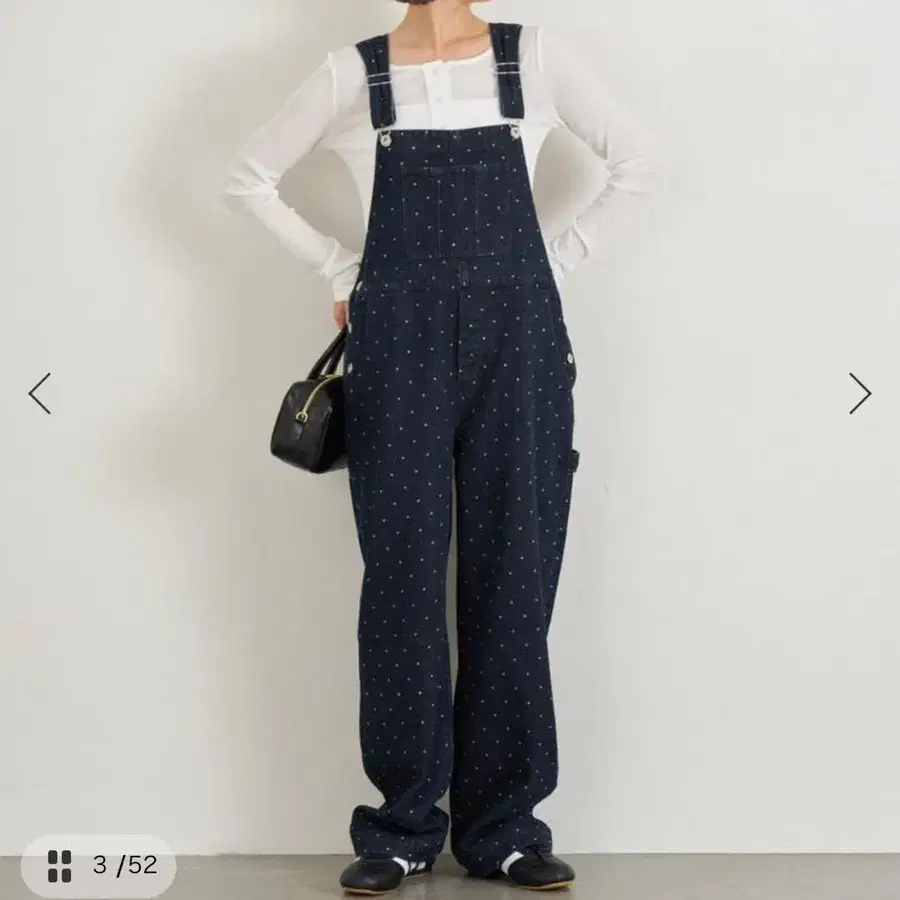 인기였던 루즈 오버롤의 형태는 그대로 원단을 도트 무늬 데님지로 변경하여,