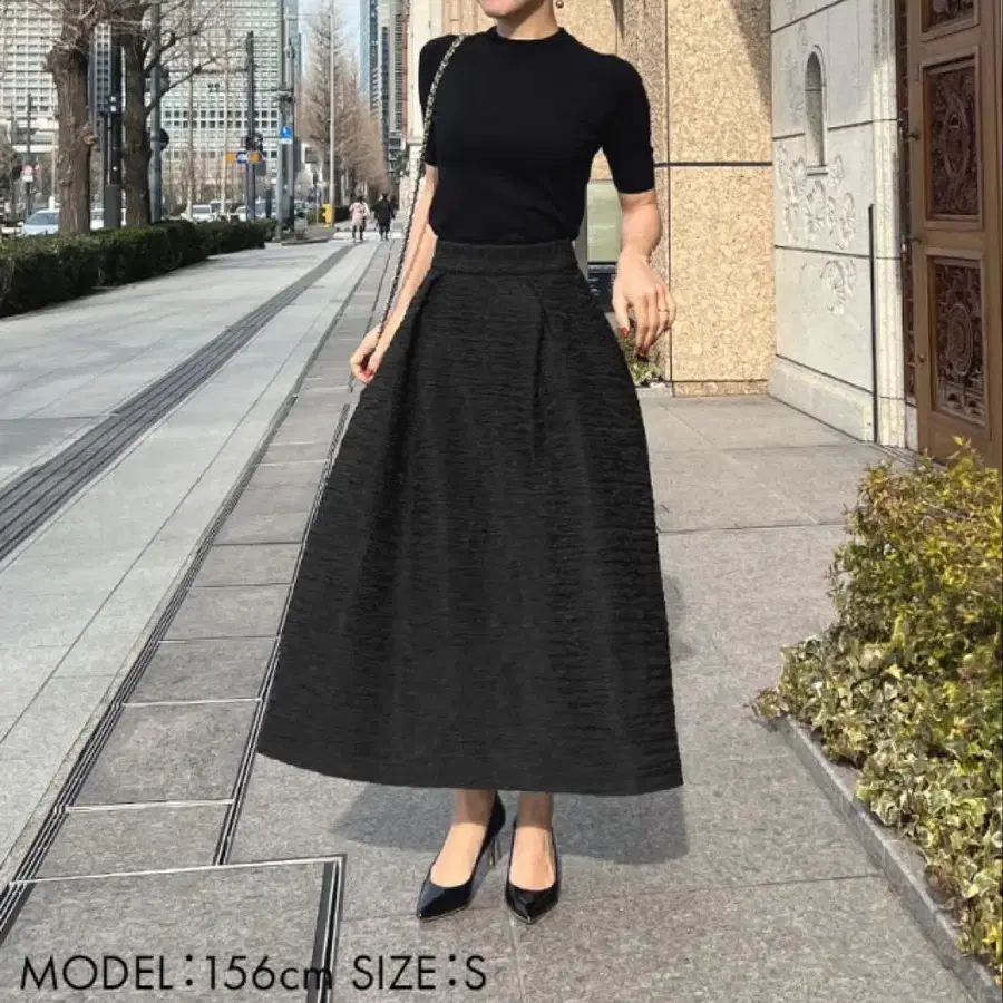 원단감을 살려 턱만으로는 낼 수 없는 볼륨을 만들어내, 어느 각도에서 보아도 아름다운 실루엣의 스커트로 완성했습니다.