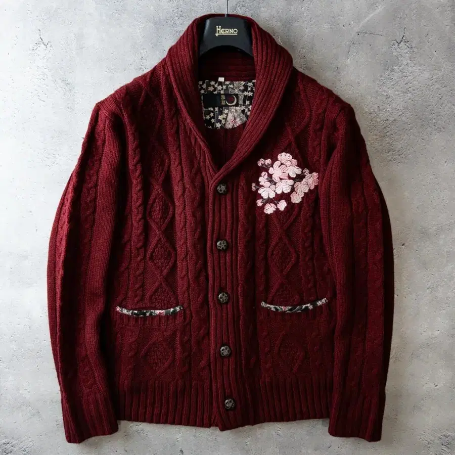 일본풍 패턴 브랜드 [ 미야비무스비 ] 의 숄카라 니트 가디건입니다. 깊이감 있는 보르도 색상의 케이블 짜임 니트에 섬세한 벚꽃 자수와 일본풍 패턴의 악센트 원단을 더해 존재감 넘치는 한 벌입니다. 버튼 하나하나에 벚꽃 각인이 새겨지는 등, 디테일까지 코다와리(고집)를 살린 디자인이 매력입니다.