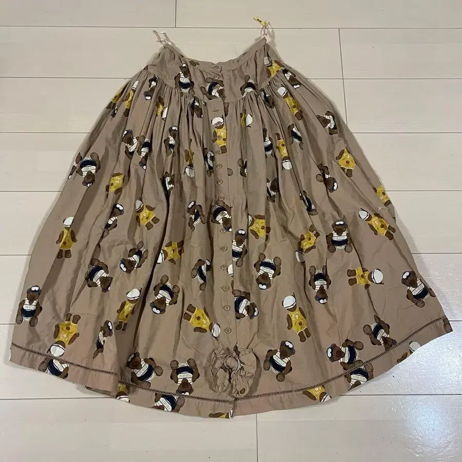 자동 번역되었어요. 원문보기곰 무늬의 브라운 플레어 스커트, 앞 버튼 디자인.