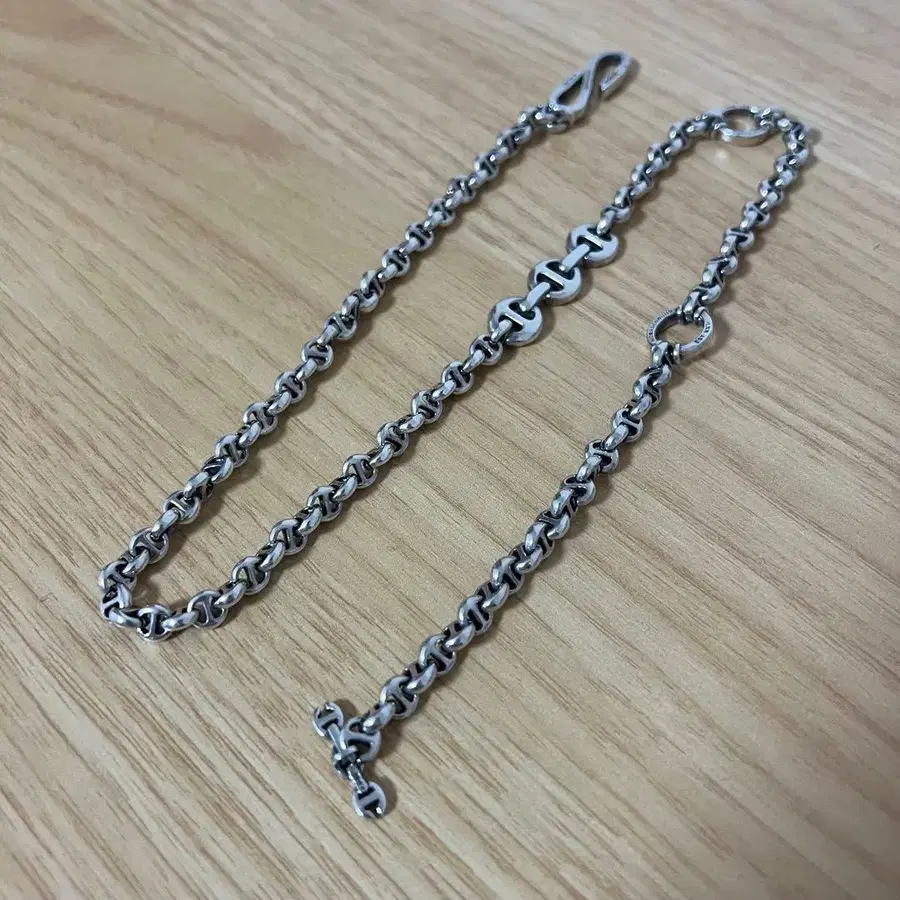 호센부스 5mm 오픈-링크 월렛 체인 오픈 링크 실버 월렛 체인 남성용 23인치 남성용 - 월렛 체인 HOORSENBUHS의 시그니처인 트라이 링크 심볼을 모티브로 한 5mm 사이즈의 월렛 체인입니다. 토글 부분에는 은은하게 다이아몬드가 세팅되어 있습니다. 2, 3회 사용한 정도입니다. 도치기 아크에서 구매했습니다. 부속품은 버렸습니다. 본체만 전달됩니다! 정가는 682,000엔 23인치 전체 길이 58.5cm, 체인 폭 최대 1.5cm HOORSENBUHS 5mm OPEN-LINK WALLET CHAIN