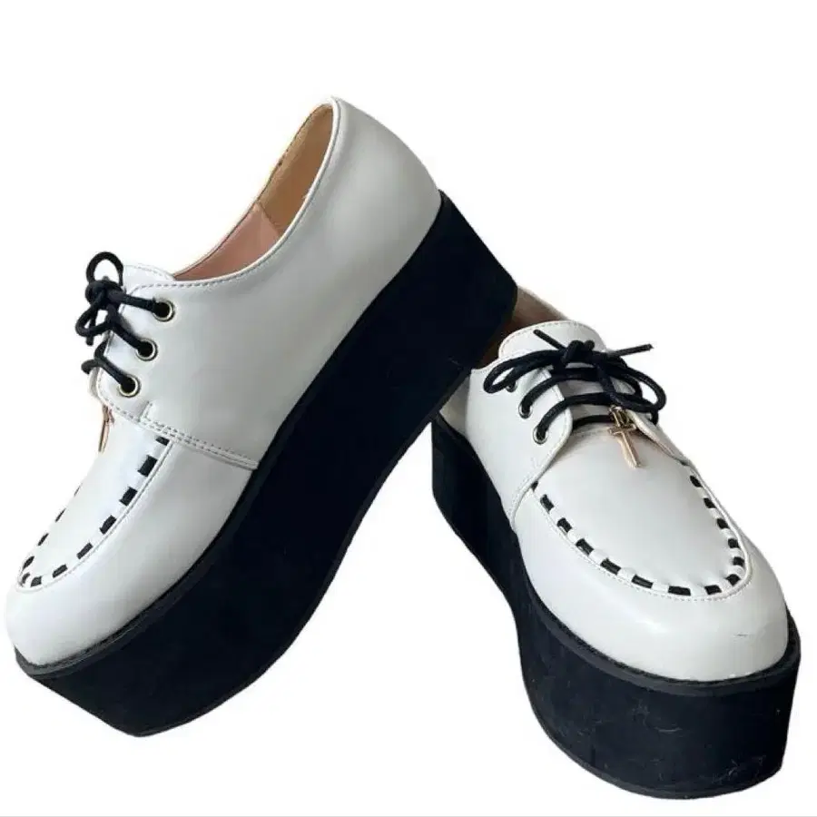 이 화이트 플랫폼 슈즈는 크로스 모티브가 특징이며, 심플하면서도 개성 있는 스타일을 연출합니다.