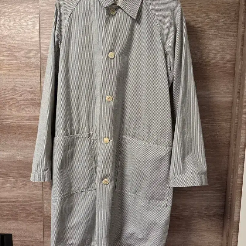 그레이 색상의 스텐카라 코트, 스트라이프 패턴 안감과 큰 버튼이 특징입니다. 사이즈는 0입니다. - 색상: 그레이 - 디자인: 스텐카라 코트 - 포켓: 앞면에 2개의 포켓 - 소재: 스트라이프 패턴 안감 - 버튼: 큰 버튼 방문해 주셔서 감사합니다.