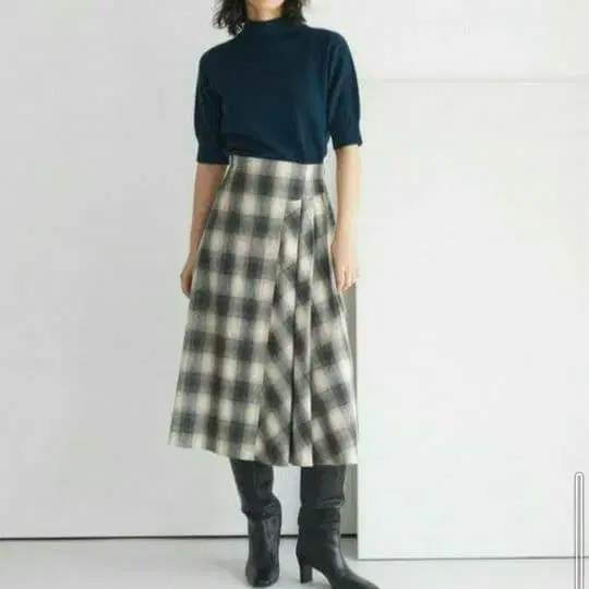 비대칭 턱을 악센트로 한 플레어 스커트는 턱을 넣어 바이어스 원단으로 체크 무늬에 변화를 주어 디자인 포인트로 삼았습니다. 다양한 색상이 겹쳐진 음영과 농담이 있는 옴브레 체크 무늬는 시크한 인상으로 즐길 수 있는 트렌디한 체크 아이템으로 추천합니다.