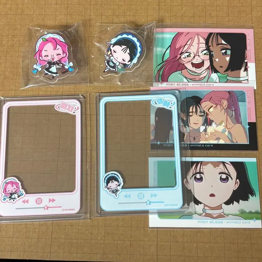 ALIEN STAGE 애니메이트 카페 아크릴 클립 미지, 수아 각 1개 데코 케이스(SD) 미지, 수아 각 1개 포토 카드 3개(그림체는 이미지 참조) 총 7개 세트 클립: 에어캡 한 겹 포장 + 침수 방지 그 외: 단면 보강 + 침수 방지