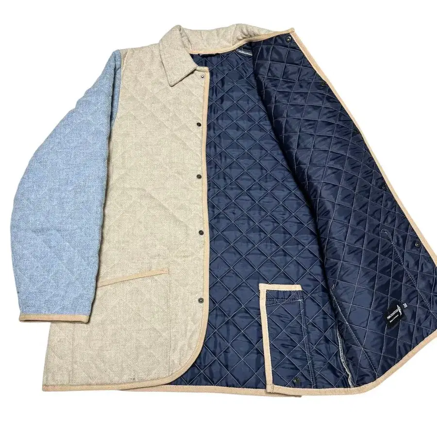 특징: 베이지, 라이트 블루, 바이컬러, 스냅 버튼, 로고 버튼, 충전솜, 카라 뒷면 코듀로이