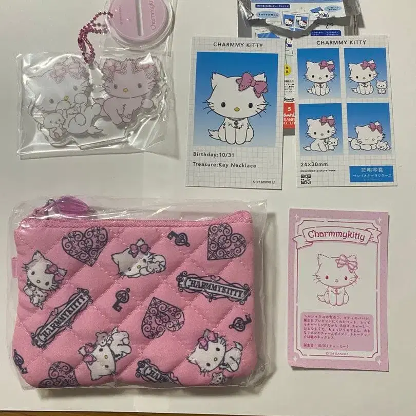 챠미키티의 아크릴 스탠드, 퀼트 파우치, 증명사진풍 스마로이드 세트입니다.